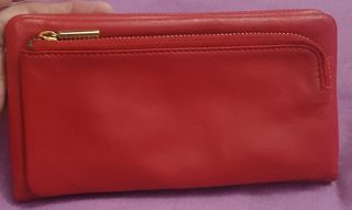 Cartera roja de Massimo Dutti de piel. Tiene espacio para monedas, billetes y tarjetas. De largo mide 20 cm y de ancho 11 cm. Es muy elegante.