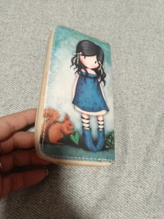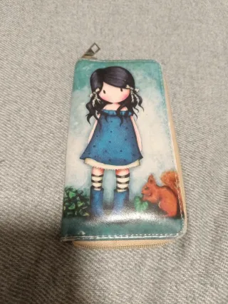 Cartera con un bonito diseño de Gorjuss. - Ilustración de una niña con un vestido azul. - Detalle de una ardilla. - Cierre de cremallera. - Cierre de monedas individual con cremallera