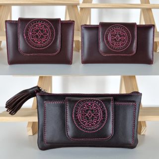 un precioso juego de cartera y llavero. - Incluye una cartera y un llavero a juego. - Son de color marrón oscuro. - Están hechos de tela de algodón. Cartera con cierre de cremallera y botón clip para tarjetas.y llaverito para poner alguna moneda, pastilla etc Medida monedero 12x10 aprox.