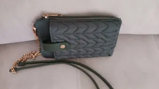 Bolso tipo cartera para llevar el móvil, con un diseño acolchado y elegante. Bolsillo lateral para tarjetas o documents. Completamente nuevo. A estrenar. - Color verde oscuro - Correa de cadena dorada. - Cierre de botón a presión. - Bolsillo lateral con cremallera.