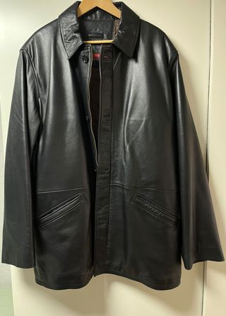Chaquetón de piel auténtica de la marca Beggar by Gerome en color negro. Vintage. Estado: Muy buen estado, el cuero está bien cuidado y sin grietas. Puesta 1 vez. Material: Exterior de 100% piel auténtica. Forro interior compuesto por 70% algodón y 30% poliamida. Cierre doble: cremallera frontal reforzada y solapa con botones. Dos bolsillos exteriores amplios. Tres bolsillos interiores (uno con cremallera, otro con cierre de botón y uno abierto para el móvil/cartera). Cuello tipo camisa. Largo total: 85 cm. Talla en etiqueta: 2X (2 XL)