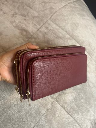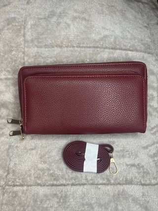 Cartera bandolera de estilo premium, totalmente nueva y sin uso, en un elegante color burdeos con acabado tipo piel granulada y herrajes dorados. Diseñada para quienes buscan elegancia, organización y comodidad en una sola pieza. Ideal para llevar como cartera grande o como bandolera gracias a su correa extraíble incluida. • Doble compartimento con dos cremalleras independientes • Gran capacidad interior (tarjetas, billetes, móvil, llaves, etc.) • Material resistente, tacto suave y fácil de limpiar