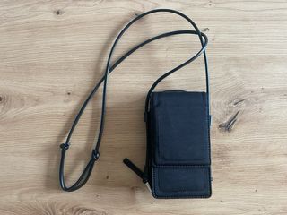 Bolso pequeño de color negro y material de nylon, estilo bandolera para llevar el móvil y la cartera. Longitud de correa ajustable. Cierre de la solapa de la funda del móvil con botón. Cierre de la cartera con cremallera. En la cartera hay tres compartimentos de tarjetero. Se ha usado solo en dos ocasiones, está prácticamente nuevo. Medidas: 17cm alto x 9cm ancho