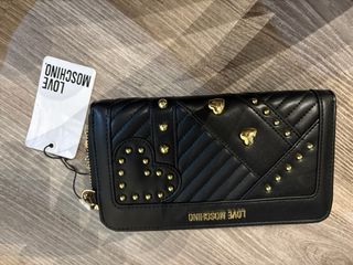 Elegante bolso de mano Love Moschino en color negro. Bolsillo especial para movil - Diseño acolchado con patrón de rombos. - Detalle de corazón con tachuelas doradas. - Tachuelas doradas adicionales en la solapa. - Logo LOVE MOSCHINO en la parte frontal inferior.