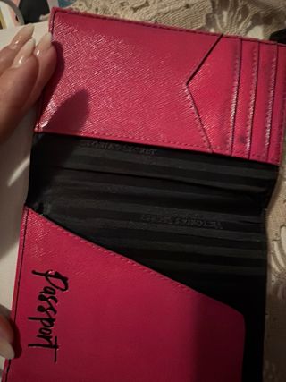 Elegante cartera para pasaporte de Victoria's Secret. - Diseño en color negro con detalles dorados. - Logo distintivo de la marca.