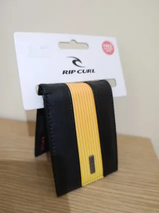 Cartera de la marca Rip Curl con un diseño moderno. - Combinación de colores negro y amarillo. - Detalle de franjas verticales amarillas. - Placa metálica con el logo. Completamente nueva! Ideal para un regalo. La cremallera funciona correctamente. Tiene billetero y monedero.A estrenar!
