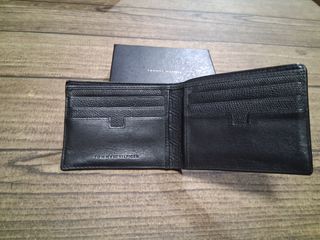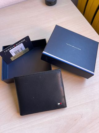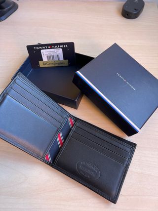 Cartera de piel de la marca Tommy Hilfiger, completamente nueva y sin usar. Se entrega en su caja original. - Diseño elegante y minimalista. - Compartimentos interiores para tarjetas y billetes. - Pequeño detalle de la bandera de la marca en la parte frontal.