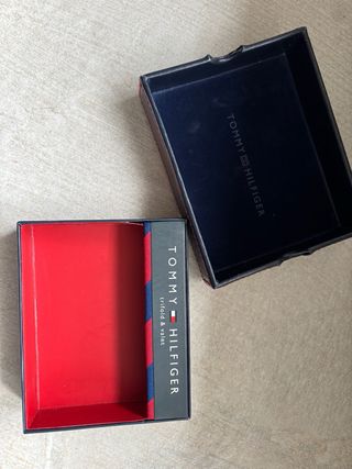 Elegante caja de polipiel azul de la marca Tommy Hilfiger. Perfecta para guardar pequeños objetos o como elemento decorativo. Es de una cartera de hombre. Tiene el resto de pegamento de la etiqueta. - Material: Polipiel. - Color: Azul con detalles en rojo.