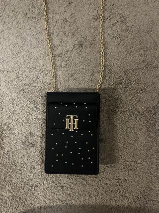 Elegante bolso con cadena dorada. Perfecto para llevar lo esencial. - Diseño con tachuelas doradas. - Logo TH en la solapa.