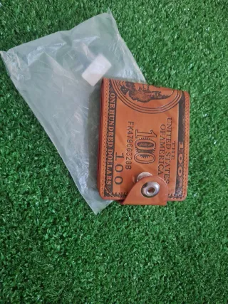 Cartera con un diseño original inspirado en billetes de cien dólares. - Diseño de billete de 100 dólares. - Cierre de botón a presión. - Color: Negro y Marrón Uno por 5€ Los Dos por 9€