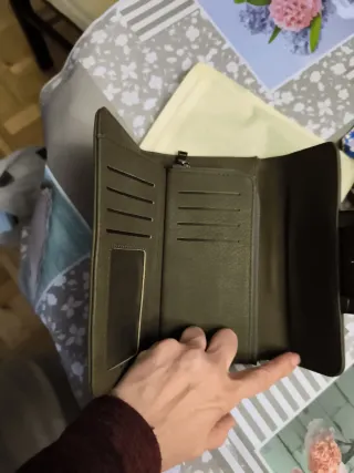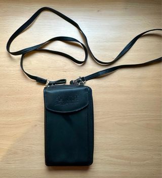 Bolso tipo cartera, ideal para llevar tu móvil, cartera, monedero, tarjetas, etc. - Diseño moderno y funcional. - Cierre de cremallera. - Correa ajustable. Se puede llevar al cuello o en bandolera. Como nuevo, lo he usado dos veces.