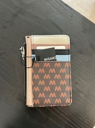 Elegante cartera Misako con un diseño moderno y práctico. - Compartimento principal con cierre de cremallera. - Múltiples ranuras para tarjetas. - Acabado con estampado de M y detalles en diferentes texturas.