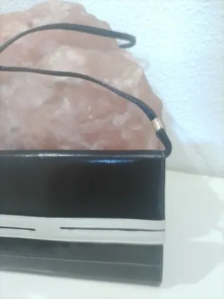 Elegante bolso cartera piel negro vintage. Presenta un diseño bicolor con detalles en contraste. 26cm ancho 17cm alto. Comprado en la antigua Galerías Preciados - Acabado brillante. - Correa de hombro delgada. - Raya horizontal decorativa en blanco.