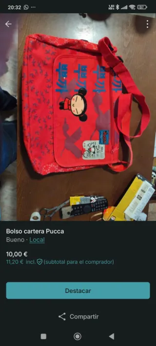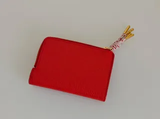 Bolso tipo cartera con el personaje de Pucca. - Diseño en color rojo. - Estampado de pájaros y grullas. - Cierre de cremallera.