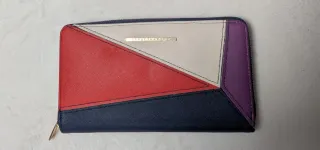 Cartera con un diseño geométrico moderno y llamativo. - Combinación de colores: rojo, blanco, azul marino y morado. - Cierre de cremallera. - Detalle metálico con el logo de la marca.