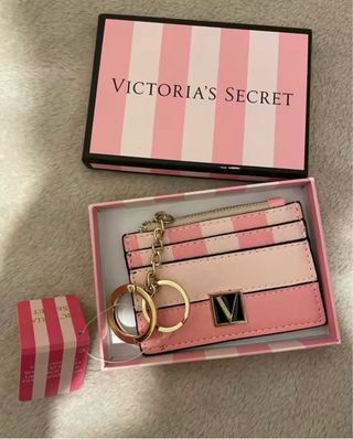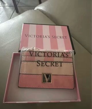 Cartera de la marca Victoria's Secret con un diseño a rayas. - Incluye llavero. - Compartimentos para tarjetas. - Cremallera superior.