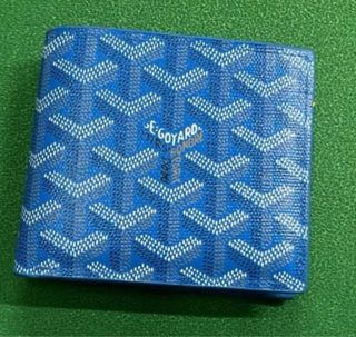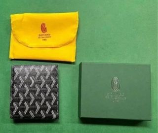 Cartera de la marca Goyard con un diseño distintivo. - Patrón geométrico en blanco y negro. - Incluye bolsa de tela amarilla. - Presentada en caja verde.