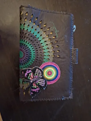 Elegante cartera de cuero con un diseño único. - Detalles calados con degradado de colores. - Cierre de botón a presión. - Cremallera lateral.