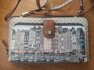 Bolso estilo cartera con un diseño de pintura de paisaje urbano y marítimo. - Cierre de botón a presión. - Correa de hombro ajustable. - Estampado detallado de edificios y barcos.