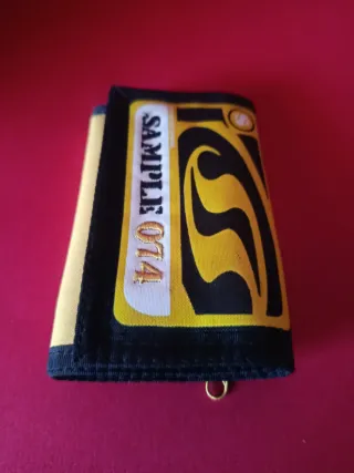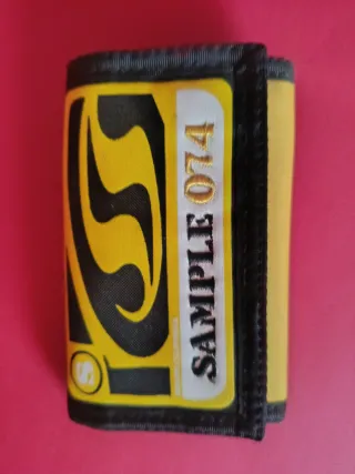 Cartera de la marca SIP California con un diseño llamativo.) Cartera SIP California Original - Modelo Sample 074 Cartera de velcro original de la marca californiana SIP. Es de lona de alta resistencia en color amarillo y negro. Muy resistente, ideal para uso diario o deportes. Cierre de velcro seguro. Interior: Espacio para billetes, tarjetas y monedero.
