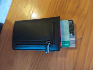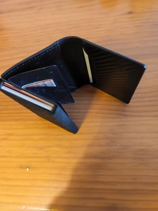 Cartera para hombre con un diseño moderno y funcional. - Tengo 5 iguales - Material: Cuero Premium y Aluminio de grado aeroespacial. - Características: Pop Up & Bloqueo RFID + Cierre con solapa. - Espacio para monedas con cremallera + bolsillo para Airtag. - Dimensiones: 9.9 cm x 7.6 cm x 2.5 cm.
