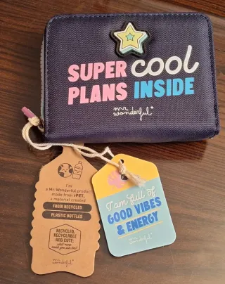 Cartera de Mr. Wonderful con un diseño divertido y motivador. Ideal para organizar tus planes. - Fabricada con PET, un material creado a partir de botellas de plástico recicladas. - Cierre de cremallera. - Detalle de estrella decorativa en la parte frontal. - Incluye dos etiquetas, una con información sobre el material reciclado y otra con un mensaje positivo. Las medidas son: 13×10×3 cm SE REALIZAN ENVÍOS!!!