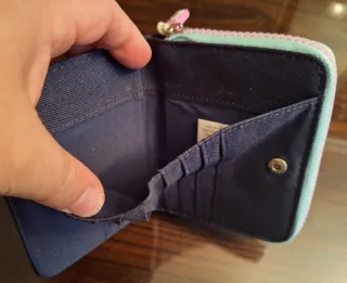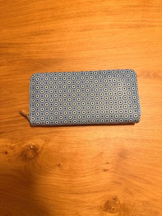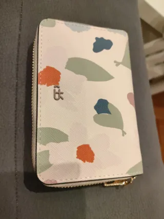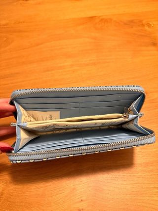 Cartera larga con un bonito estampado floral en tonos azules y blancos. Es un accesorio práctico y elegante. Sin estrenar pero con signos de desgaste en el lateral como se muestra en la foto - Diseño con cierre de cremallera. - Múltiples compartimentos interiores.