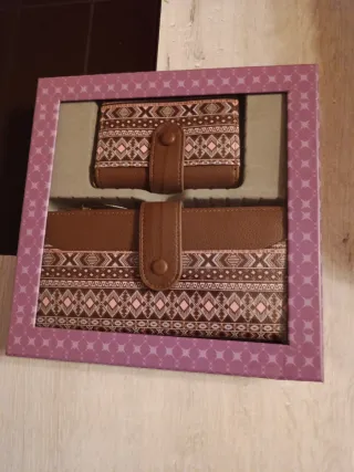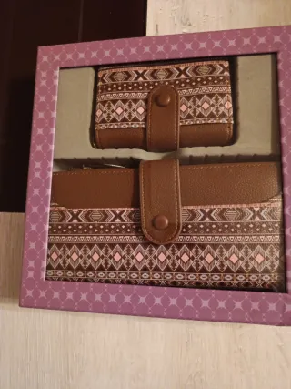 Set de dos carteras nuevas, presentadas en su caja original. - Diseño con estampado geométrico. - Cierre de botón a presión. Excelente regalo
