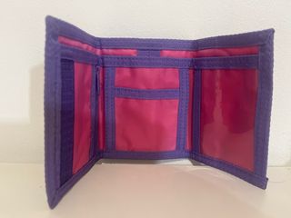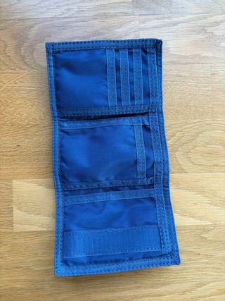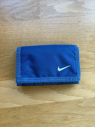 Cartera de tela azul con el icónico logo de Nike. - Cierre de velcro. - Diseño compacto y funcional. - Espacio para monedas, billetes y tarjetas.