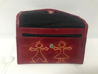 Cartera en color rojo con un diseño original. - Grabado de figuras humanas estilizadas. - Cierre de solapa.