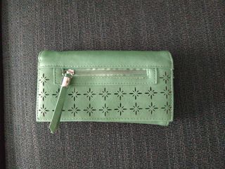 Billetera en color verde, con espacio para tarjetas, y espacio para monedas con cremallera. Medidas: 16,5 de ancho, 9 cm de alto y profundidad 3,5cm. Poco uso.