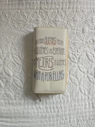 Cartera con un diseño único y un mensaje inspirador. - Frase: Las cosas buenas pasan a quienes las esperan. Las mejores van a por ellas. - Color: Beige y blanco. - 1 bolsillo con cremallera. - 2 apartados para tarjetas.