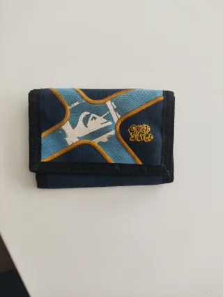 Cartera infantil de la marca Quiksilver con un diseño llamativo. Estampado frontal con líneas y logo. Cierre de velcro.