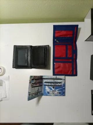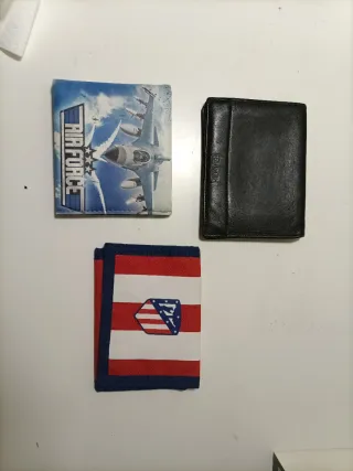 Conjunto de tres carteras con diseños variados. - Una cartera negra. - Una cartera con diseño de avión Air Force. - Una cartera con diseño de bandera y escudo.