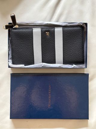 Elegante cartera Trussardi Jeans con un diseño de rayas. - Diseño de rayas verticales en blanco y negro. - Logo de Trussardi Jeans en la parte frontal.