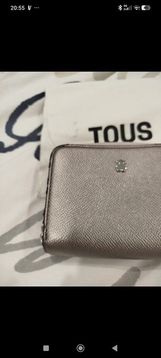Elegante cartera Tous modelo Dubay. - Diseño moderno y sofisticado. - Acabado metalizado en tonos dorados y plateados. - Pequeño detalle de oso Tous en la parte frontal.