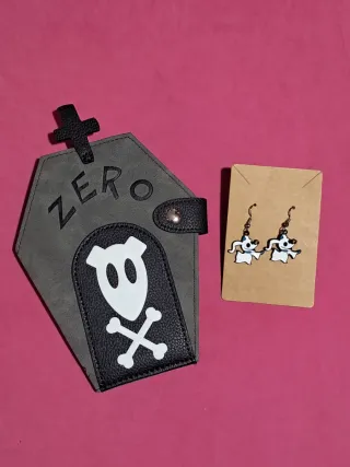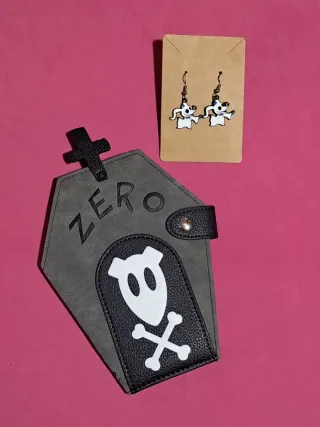 Set de cartera con forma de ataúd y pendientes inspirados en Zero. - Cartera con diseño de ataúd y detalles de calavera y tibias cruzadas. - Cierre de botón a presión. - Pendientes con figura de perro fantasma. Pesadilla antes de navidad