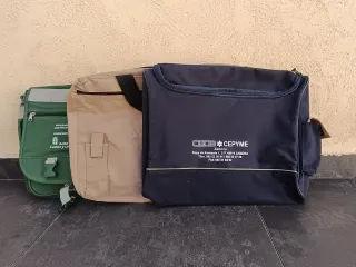 Conjunto o lote de tres carteras o bolsos de tela, NUEVAS procedentes de cursos, charlas. Sencillos pero ideales para guardar documentación o para transporte. - Distintos y variados espacios de almacenamiento. - Sin uso, con logos de entidades promocionales. - La verde posee correa grande para hombro. - La marrón, de Protección Civil, no es propiamente tela, es más bien rafia o similar. *** MIRA MI PERFIL. CREA UN LOTE Y AHORRA EN GASTOS DE ENVÍO***