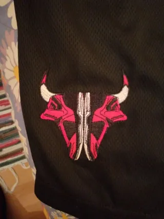 Casaca deportiva negra con el nombre Chicago bordado en blanco y rojo. Diseño tipo béisbol. Cierre con botones al frente. Recoger en Horta.
