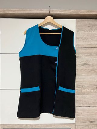Casaca de peluquería con un diseño moderno y elegante. - Cierre cruzado con botones. - Bolsillos frontales. - Mangas cortas. Casi sin uso