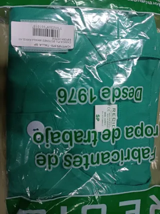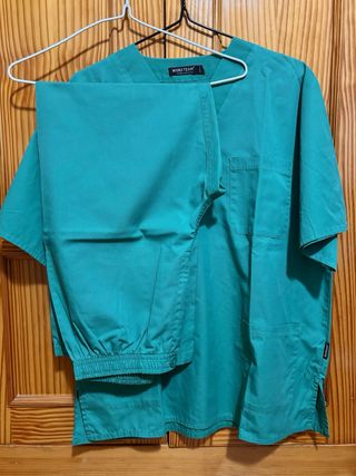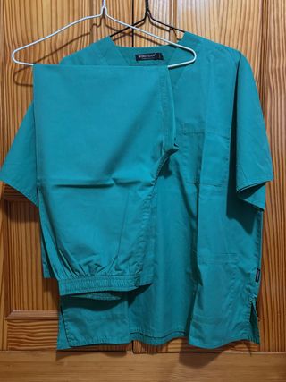 Casaca de pijama sanitario (3 bolsillos). La casaca tiene algunas manchas de parafina y algún resto de tinte (fotos). Pantalón de pijama sanitario (2 bolsillos y cintura bastante elástica). Bata con 3 bolsillos y botones. Todo es talla S.