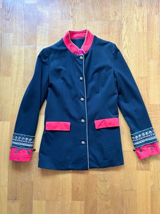 Elegante blazer con un diseño tipo casaca. - Cuello alto con ribete rojo. - Cierre de botones frontales. - Bolsillos con solapa en color rojo. - Puños adornados con bordado y detalles colgantes.