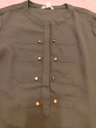 Camisa de manga larga con un diseño inspirado en casaca militar. El color verde kaki le da un toque moderno y versátil. - Cierre parcial con botones dorados. - Bolsillos decorativos en el pecho. - Puños abotonados.