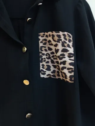 Casaca elegante de color negro con un detalle llamativo. - Bolsillo frontal con estampado de leopardo. - Botones dorados. - Cuello camisero.
