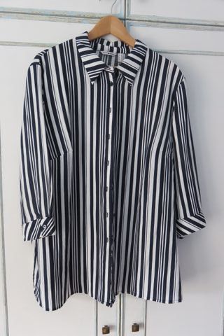 Punto Roma. Casaca o sobrecamisa. Rayas blanco y negro. Manga larga tipo ranglán. Talla 54. Travilla con botón en mangas. Composición 69% viscosa, 20% poliamida y 11 % lino.. Medidas hombros 45 y largo 82. Ligero y cómodo