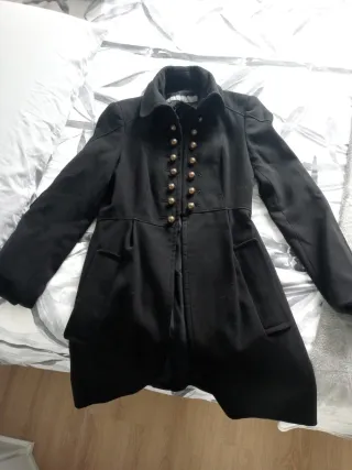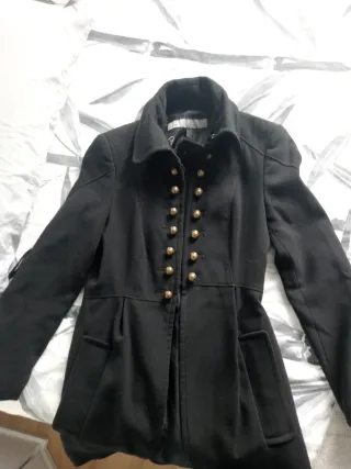 Chaqueta estilo casaca militar con cuello mao. - Adornos dorados en el frontal, en cuello y puños - Cierre frontal con corchetes. - Corte entallado. Es talla L pequeña, equivalente a una M