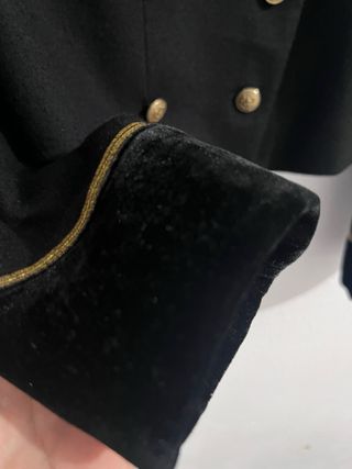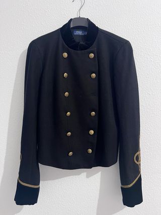 Elegante chaqueta de estilo militar de Polo Ralph Lauren. - Diseño cruzado con botones dorados. - Cuello de terciopelo. - Adornos bordados en las mangas. - Puños y bajo de terciopelo. su precio original: 400 euros, la dejo en este precio porq lo único q le falta es un botón. usado una sola vez