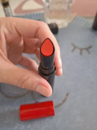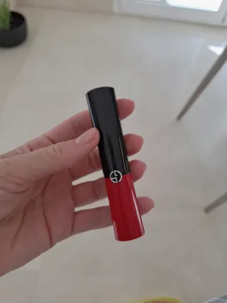 Pintalabios de la marca Giorgio Armani en un llamativo color rojo. - Diseño elegante con detalles plateados. - Tapa negra brillante.