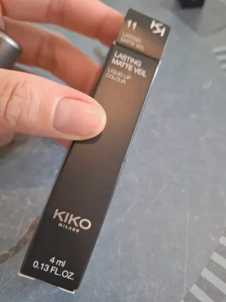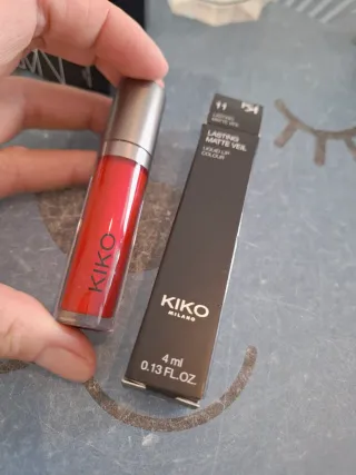 Labial líquido de Kiko Milano en acabado mate y color rojo intenso. El envase es transparente y el capuchón plateado. - Tono: 11 Lasting Matte Veil - Contenido: 4 ml / 0.13 fl.oz.