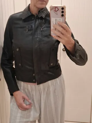 Chaqueta de cuero estilo motero con un diseño moderno y favorecedor. - Cierre frontal con cremallera. - Bolsillos con cremallera. - Cinturón ajustable en la cintura. Buen estado, solo le faltaba botones del cierre de abajo, ver la foto.